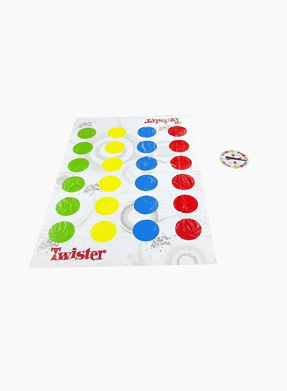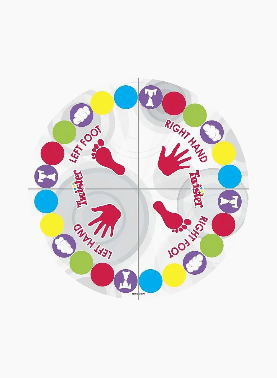 В игре "Twister" Вам предстоит ставить руки и ноги в разные места на коврике, не падая! Два новых хода! При выборе Spinner's Choice спиннер делает ход, который должен сделать другой игрок. Забавные идеи Spinner's Choice на обратной стороне спиннера! Если спиннер приземляется на "Air", игрок должен поднять руку или ногу в воздух!