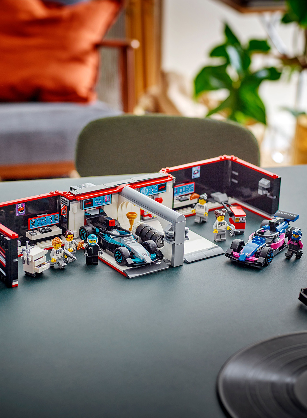 Набор включает 2 официально лицензированных автомобиля — стильный Mercedes-AMG и элегантный спортивный Alpine — а также гараж с инструментами, и 4 минифигурки: механики и водители. Дети могут строить, участвовать в гонках, заправлять машины и разыгрывать захватывающие сцены из собственного автомобильного города.